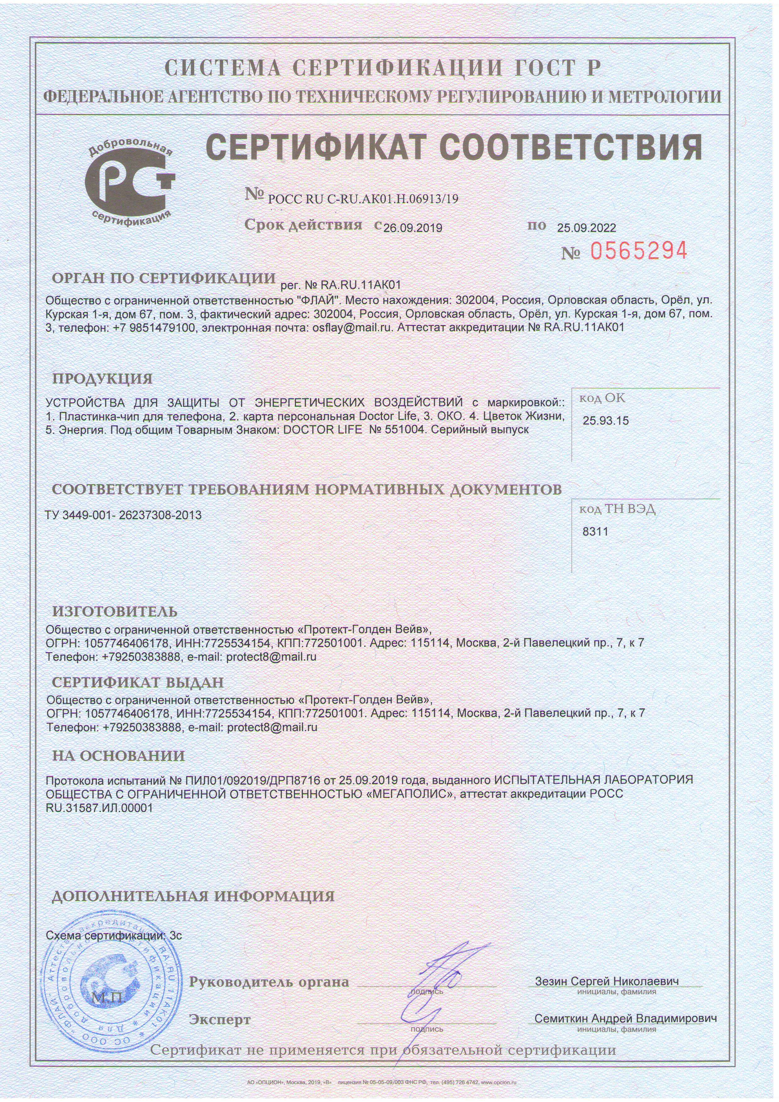 Изготовитель — ООО «Протект-Голден Вейв»